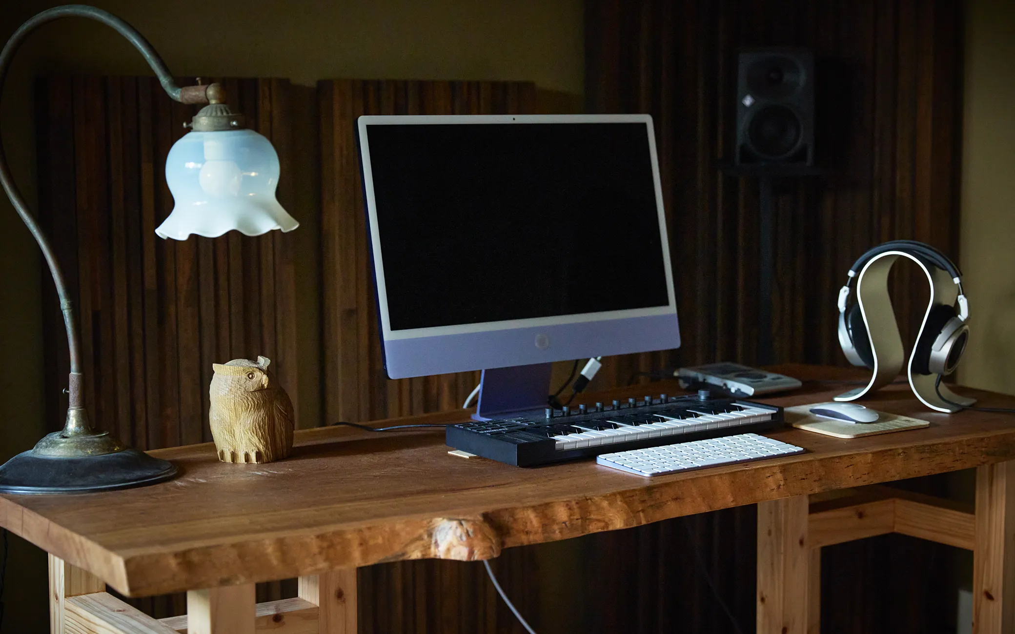 録音機材が並ぶスタジオでも木の存在感が圧迫することはない。むしろ音を整えるための土台になってくれる感覚があるという。
