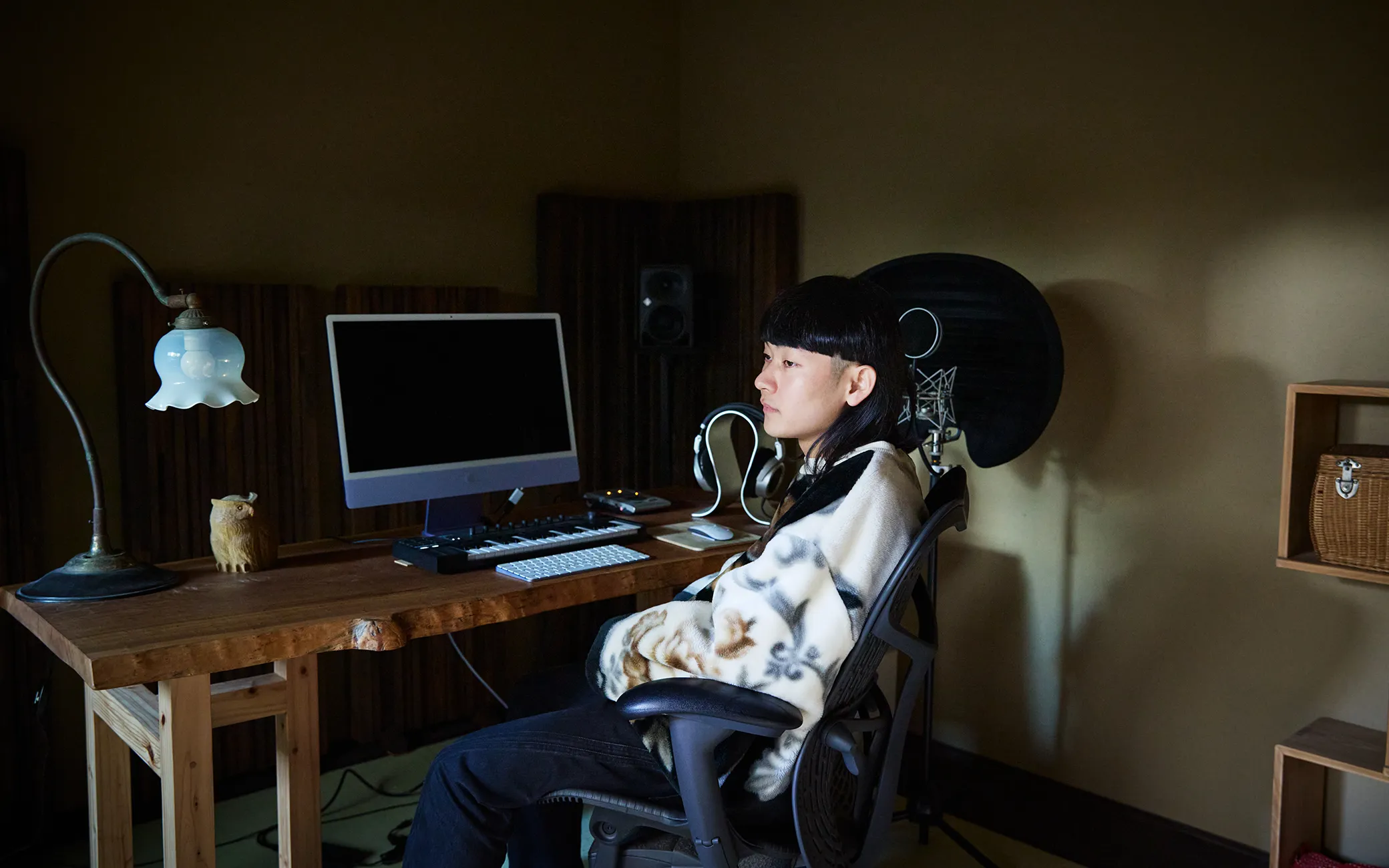 暗めで落ち着いたスタジオに、赤や黄色がさりげなく色を添える。SHOW-GOさんにとって、この暖簾は単なるインテリアではなく、制作モードに入るためのスイッチだという。