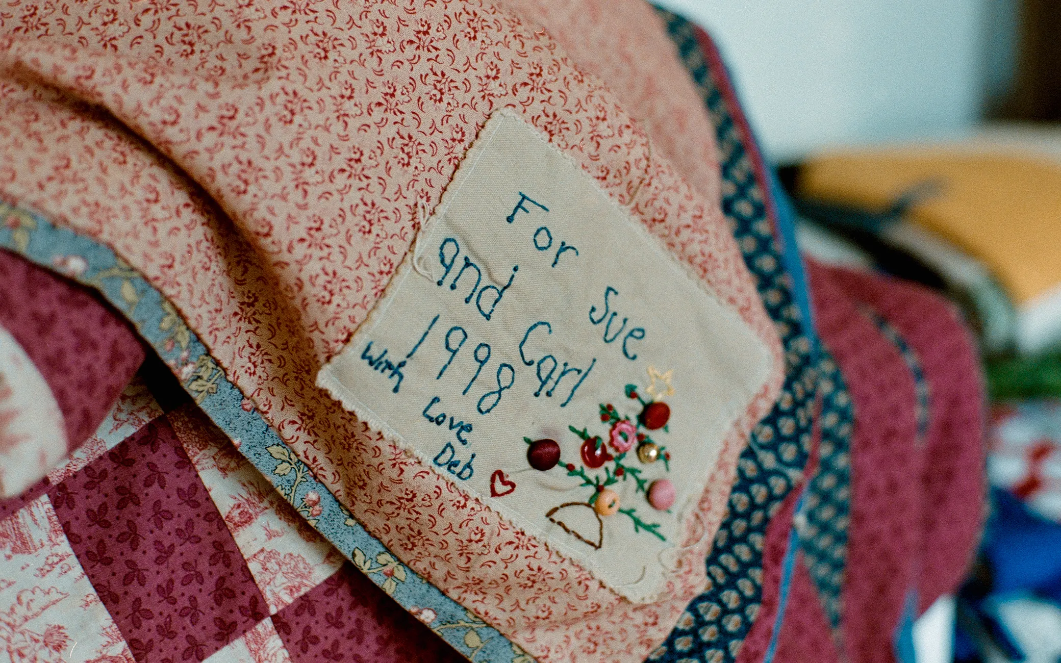 アメリカのキルトは、メッセージのタグもそのまま。子どもへのプレゼントとして贈られたものだという