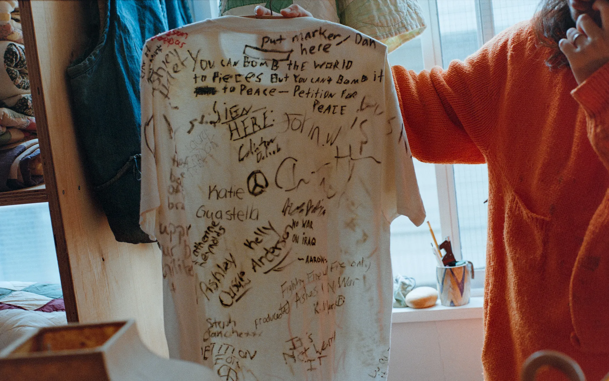 西海岸の古着店で見つけた一着。寄せ書きTシャツというジャンル自体は珍しくないが、このTシャツは、“NO War”(反戦)のメッセージが多く書き込まれているところに強く惹かれたという。
