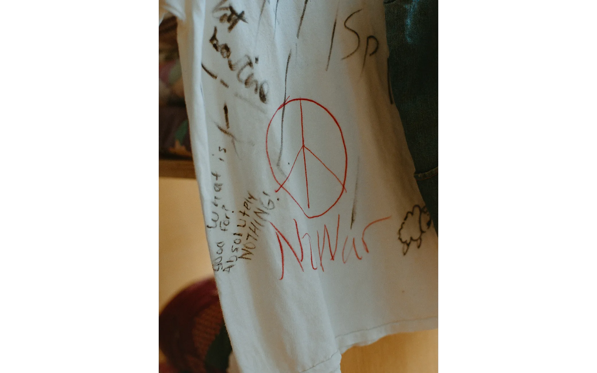 西海岸の古着店で見つけた一着。寄せ書きTシャツというジャンル自体は珍しくないが、このTシャツは、“NO War”(反戦)のメッセージが多く書き込まれているところに強く惹かれたという。