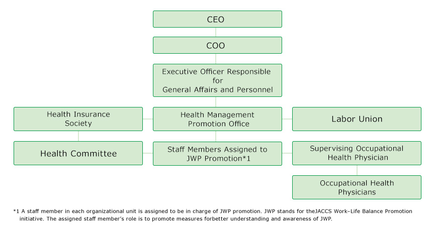JACCS Group recognizes the importance of each employee being able to work energetically and with peace of mind while maintaining a high level of physical and mental health. Based on a health and productivity management philosophy, JACCS Group works strategically to maintain and enhance employee health, and aims to realize working styles and a work environment environment in which employees can achieve a work–life balance.