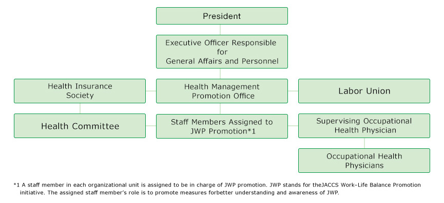Employees take their own initiative in efforts to realize a work–life balance, and work while maintaining a sense of satisfaction and fulfillment as they aim to lead a rich life, both physically and mentally. Through efforts to reform working styles and strengthened collaboration on health issues with the Company’s health insurance society, JACCS supports the maintenance and enhancement of employee health. JACCS’ fundamental policy is to aim for the realization of an open, employee-friendly work environment. As part of the structure to promote these objectives, the Company established the Health and Productivity Management Promotion Committee.