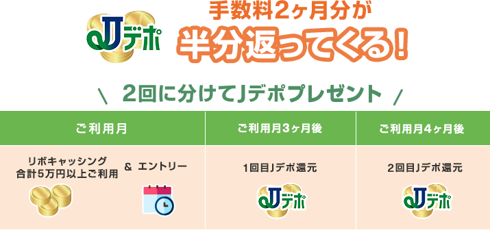 例:1月にご利用いただき、Jデポプレゼント対象となった場合、1回目Jデポ還元は4月、2回目Jデポ還元は5月となります。