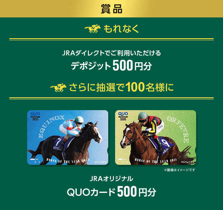 期間中、JRAダイレクトに新規ご登録のうえ、勝馬投票券を3回以上または3,000円以上ジャックスカードでお支払いいただくと、もれなくJRAダイレクトでご利用いただけるデポジット500円分をプレゼント。さらに、3,000円を1口として抽選で100名様にJRAオリジナルQUOカード500円分をプレゼント。